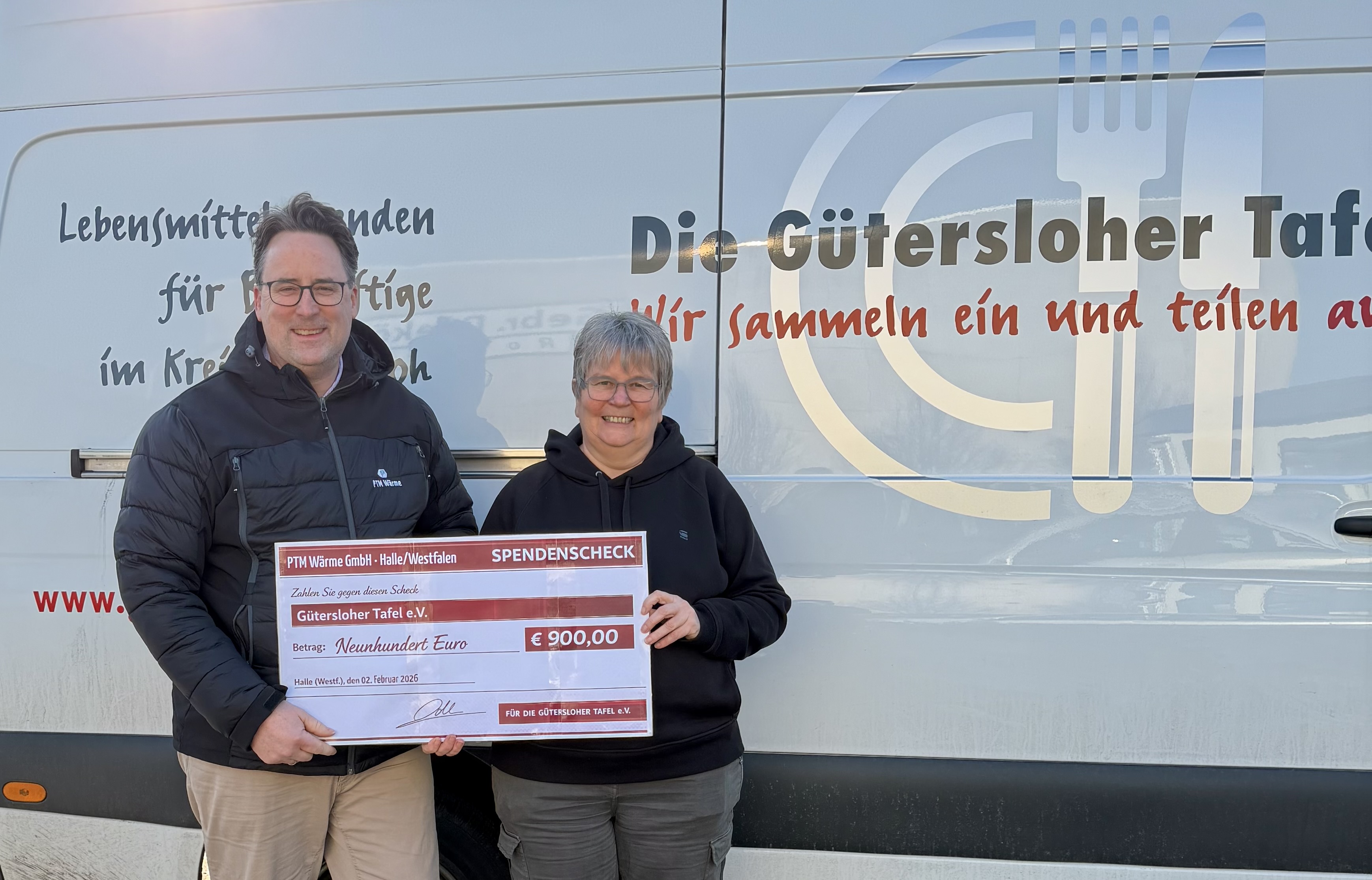 Am 2. Februar 2026 überbrachte Geschäftsführer Oliver Maître persönlich den Spendenscheck in Höhe von 900,00 Euro an die Geschäftsführerin der Gütersloher Tafel, Ruth Prior-Dresemann. Mit der Spende unterstützt die PTM Wärme GmbH die wichtige Arbeit der Tafel, die sich für die Versorgung bedürftiger Menschen in der Region einsetzt.