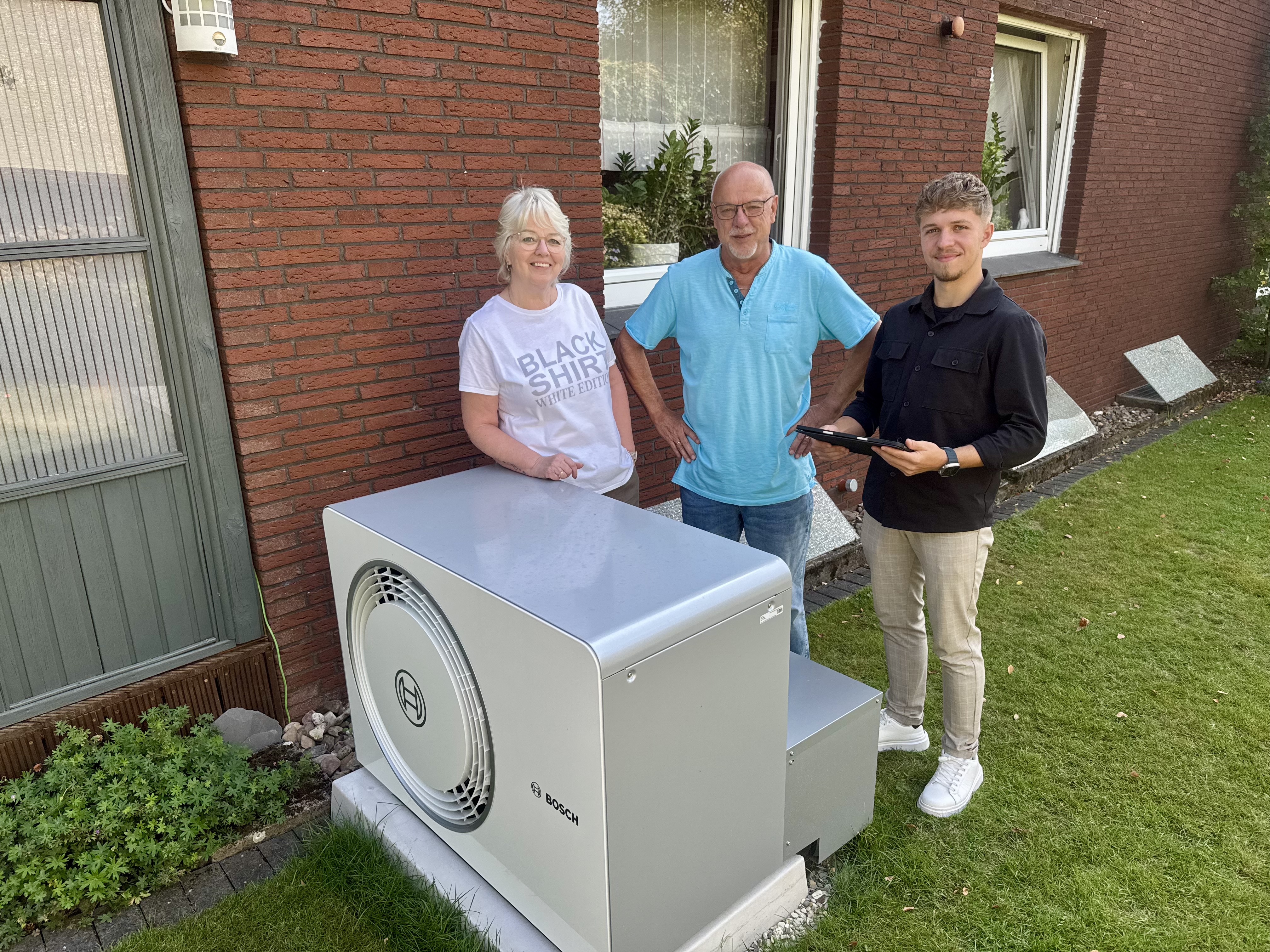 Innerhalb nur einer Woche war bei Familie Lakemper die alte Heizung entfernt, die neue Wärmepumpe eingebaut und die PV-Anlage installiert. Umgesetzt wurde das Projekt durch die firmeneigenen Handwerker von PTM Solar – Meisterbetrieb für Elektro, sowie von PTM Wärme, Meisterbetrieb für Heizungsanlagenbau. „Wir beschäftigen mittlerweile 33 Mitarbeiterinnen und Mitarbeiter, darunter drei Meister“, betont Geschäftsführer Maître.